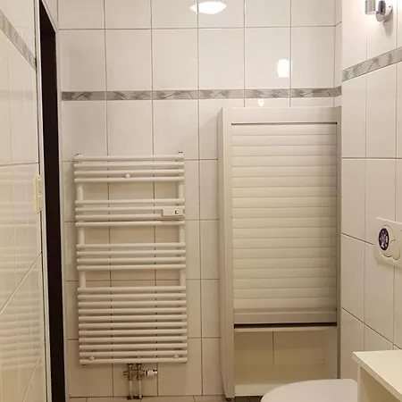 Apartment Chez Esmara Et Philippe is equipped with a bathroom that features a hair dryer and bath sheets. A tub, a walk-in shower, and a separate toilet can also be found.